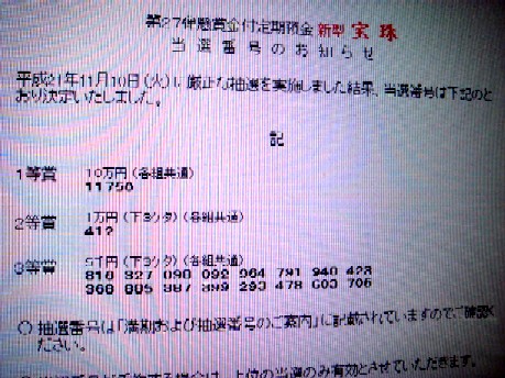 ・尼崎信用金庫懸賞金付き定期預金”宝珠”3等賞5000円 2009.11.11.