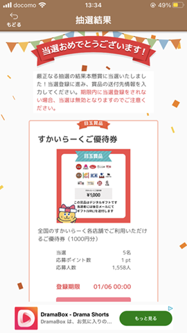 毎日ログインするだけでも応募券もらえるので、適当に応募してたらいくつか当たった!