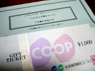…なおちゃが応募し見事当たりました。 …コープのインターネット会員10万人突破記念日予想が偶然?当たったようです。やるー!