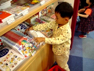 悠真も物色中。結局「イチジョウマン シール」を購入。260円もする。高い! 渋谷行きのバスもキャラクター付き。