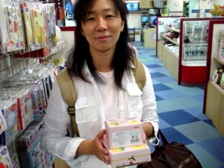 スタジオパーク内のキャラクターグッズ屋で買い物をするなおちゃ。おじゃる丸グッズを購入しご満悦。