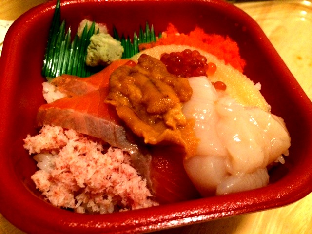 数の子、ウニ、イクラ、サーモン、ほたて、鮭フレーク、とびっこ。まさに北海づくし。でもウニ苦手なのよねぇ・・
