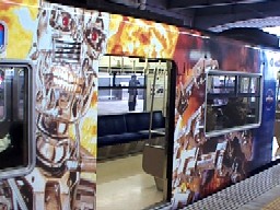 JR大阪から環状線・内回りで西九条へ。 そこで夢咲き線に乗り換え、ユニバーサルシティ駅へ。 大阪からは15分ほどで行ける。 写真はターミネータ2がペイントされたシャトル列車。 雰囲気を盛り上げる。